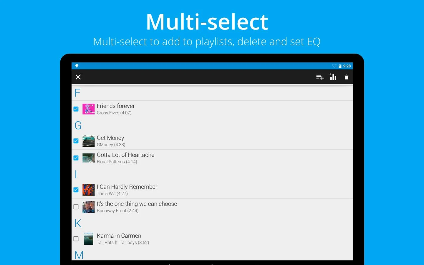 - Multiselect – select multiple items to add to a playlist for creating quick playlists