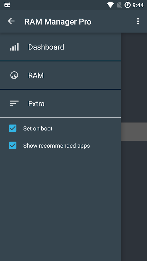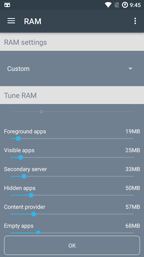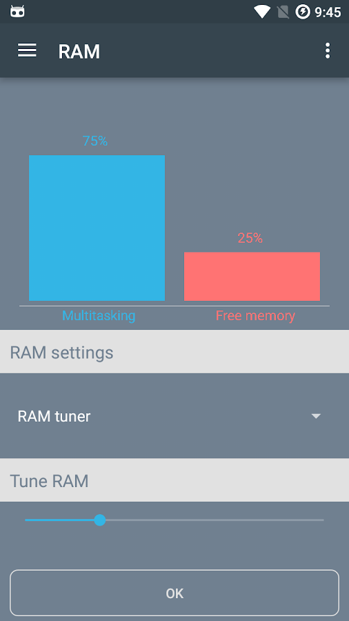 - Open RAM section and choose RAM tuner, now you can specify by slider how much free memory or multitasking you want.