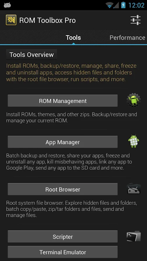 ROM Toolbox combines all the great root apps into one monster app with a beautiful and easy to use interface. ROM Toolbox has every tool you need to make your Android device fast and customized to your liking. Save 85% by getting ROM Toolbox instead of spending $30 or more on other apps.