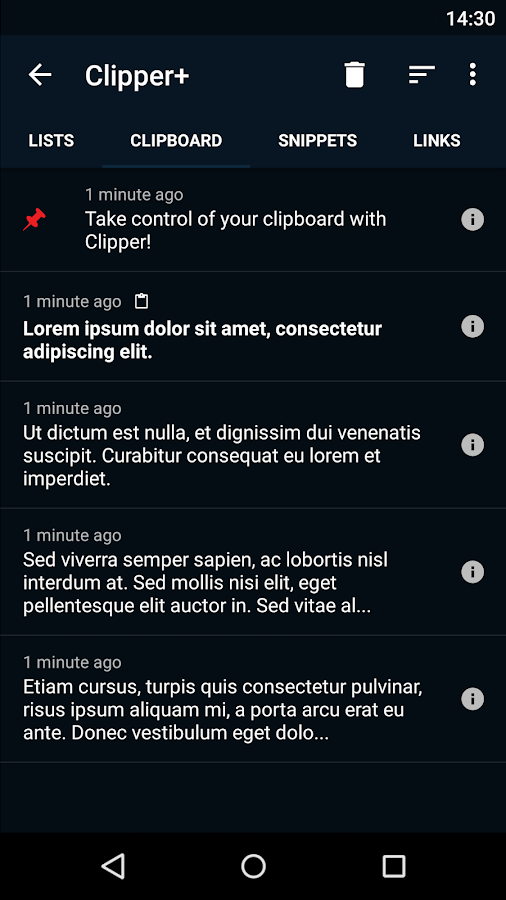 Clipper Plus is a powerful clipboard manager that automatically saves everything you copy. Access your collected clippings later and organize them in lists. Copy, paste, view, edit and share their contents. Store repetitive pieces of text in Clipper and copy them whenever you need to. Take control of copy and paste with Clipper!