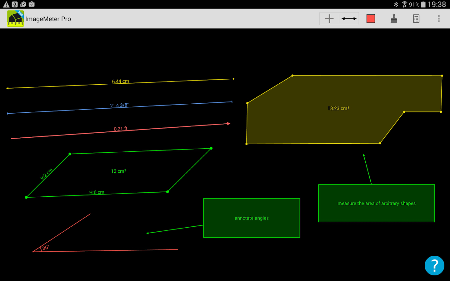 ImageMeter lets you measure dimensions, angles and areas in your photos with ease. No more need to draw a sketch of your apartment or furniture. Simply take a photo and annotate it with the dimensions on your phone or pad.