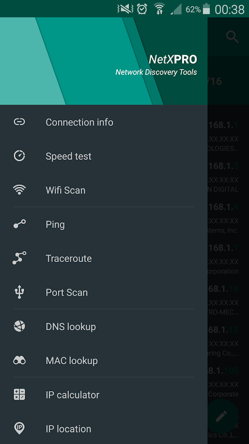 - Shows information about the wifi connection (external IP, signal strength, download and upload speed, subnetmask, gateway, DNS).