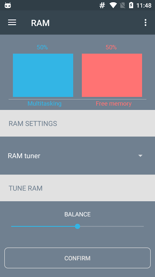 - RAM tuner - Balance, More free memory, More multitasking, Hard gaming, Hard multitasking