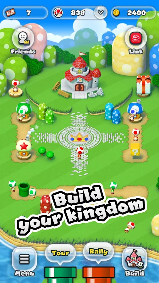 Combine different buildings and decorations to create your own unique kingdom. There are over 100 kinds of items in the Kingdom Builder mode. If you get more Toads in Toad Rally, the number of buildings and decorations available will increase. With the help of the friendly Toads you can gradually build up your kingdom.