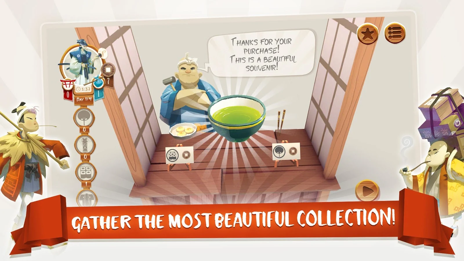 While Tokaido retains the famous clean graphic design of the boardgame, it offers unprecedented immersive 3D, realtime graphics, all accompanied by a superb and unprecedented soundtrack, composed specifically for the game.