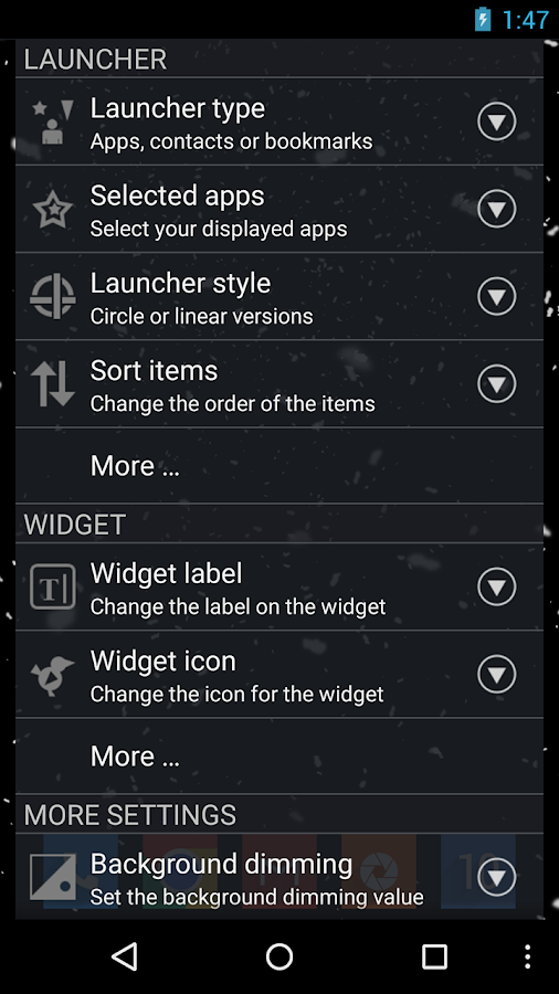 You can add some frequently used apps, contacts or bookmarks to this launcher and start those apps, contacts or bookmarks with one click from a circle, a horizontal or a vertical line. Use the included launcher icons, load your own image or use a icon from any icon pack (CircleLauncher icon packs, ADW and Go Launcher icon packs supported). If you slide over the icons, they are animated a little bit mac-like ... just try it!