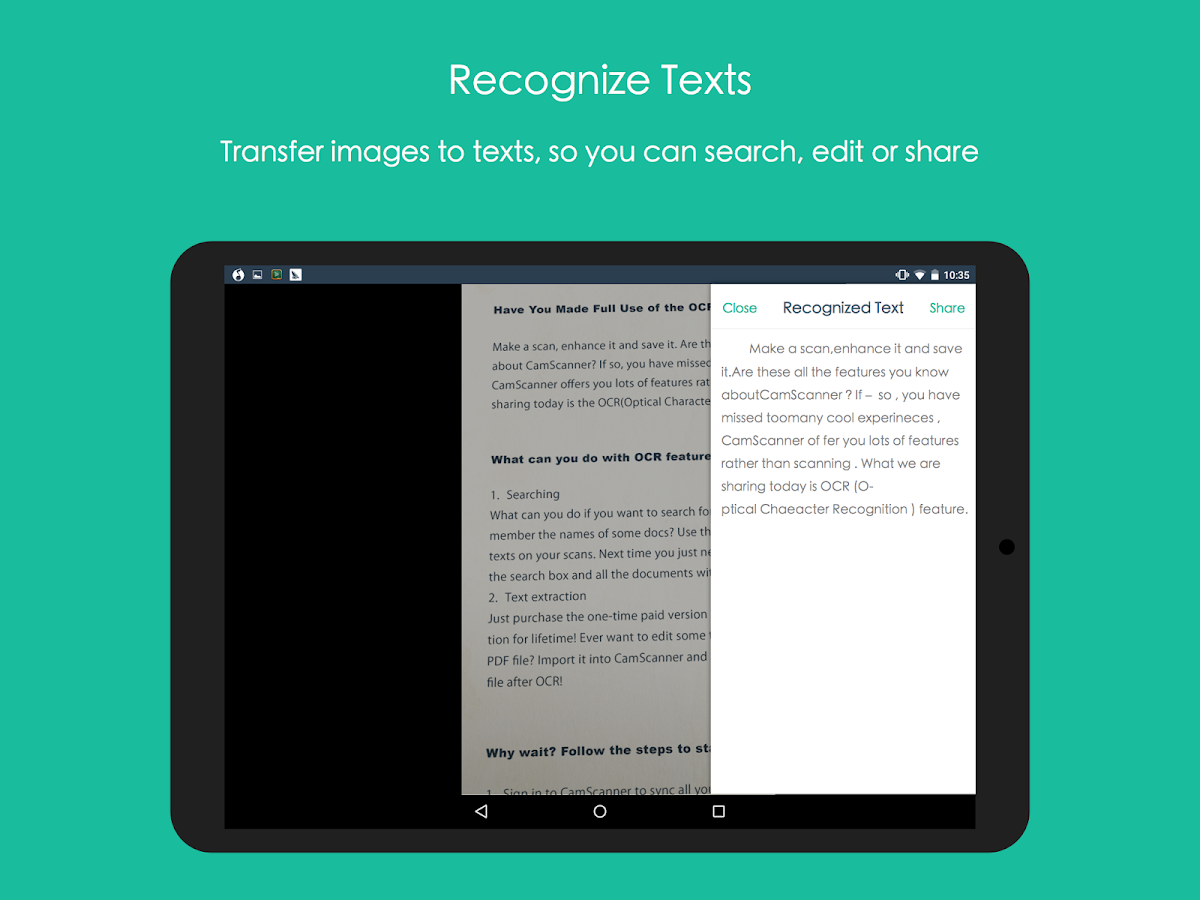- OCR (optical character recognition) feature recognizes texts in document images and extract them from images for later searching, editing or sharing. (Paid app only)