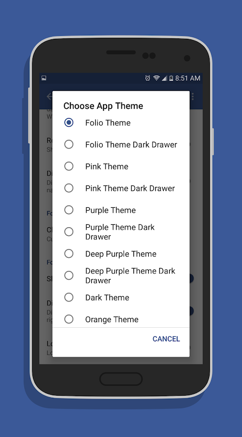 - Folio Pro uses the official Facebook SDK to personalize your experience by getting your profile photo, cover photo, and name placed beautifully in the navigation drawer.