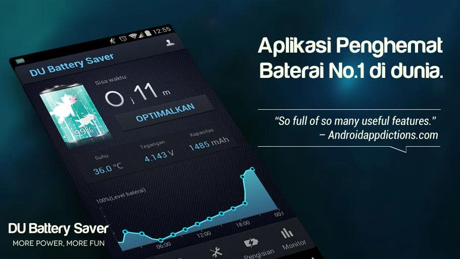 DU Battery Saver, the world’s leading battery saver and Android power doctor & manager, is a FREE battery saving app that makes your battery last longer! Get up to 50% more battery life for Android phones or tablets! With DU Battery Saver’s smart pre-set battery power management modes, one-touch controls and healthy charge stage features, solve battery problems and extend your battery life.