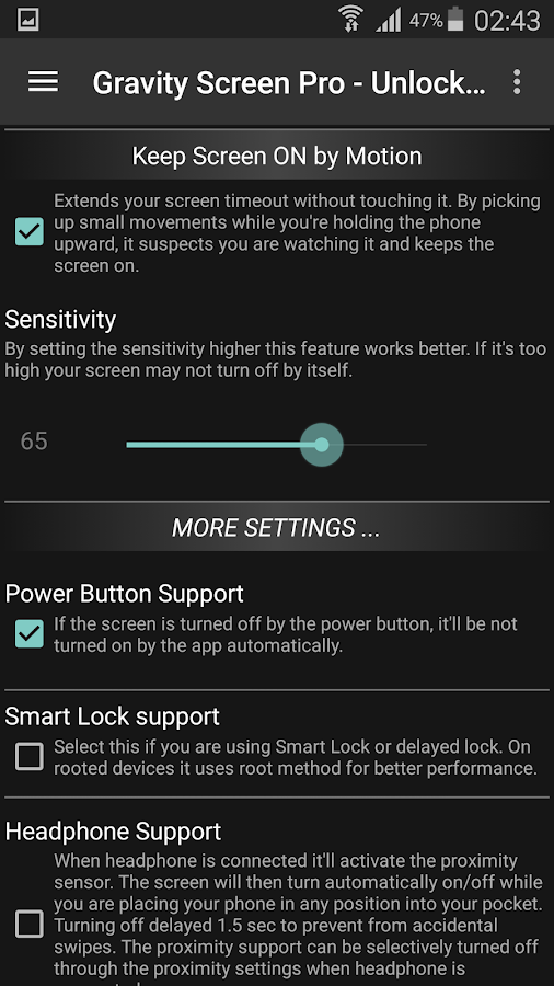 - Turn Screen On by Motion: If the screen is off and it’s facing up the device can be woken up by moving it.