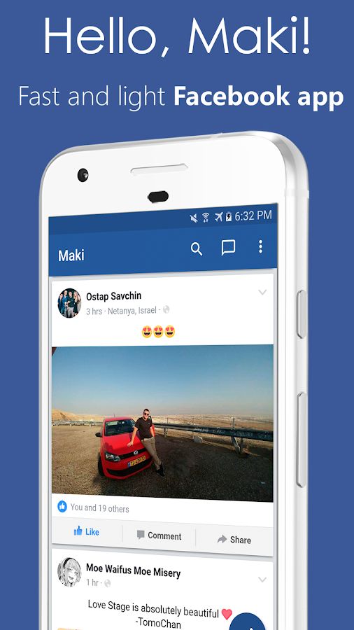 You need light Facebook app (only 13 Mb) that works fast and stable with awesome functionality, including quick access to Facebook anywhere, colorful themes and power saving mode. Maki does this. And even more. Share emotions with friends and get notifications from them with Maki – the best Facebook wrapper app.