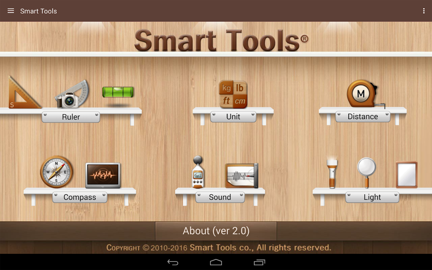 Smart Tools is a handy tool box app with 40 smart DIY and metering tools like bubble level, ruler, compass, distance meter, unit converter, DB meter, protractor, stopwatch, NFC, bar and QR reader… Use device’s in-built sensors in all in one tool box app, handy like a swiss army knife.