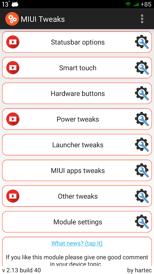 - Hardware buttons tweaks section: Fake fingerprint, Home button lock/unlock screen, Volume buttons controls music player, Cursor movement, Fast camera exec and more features.
