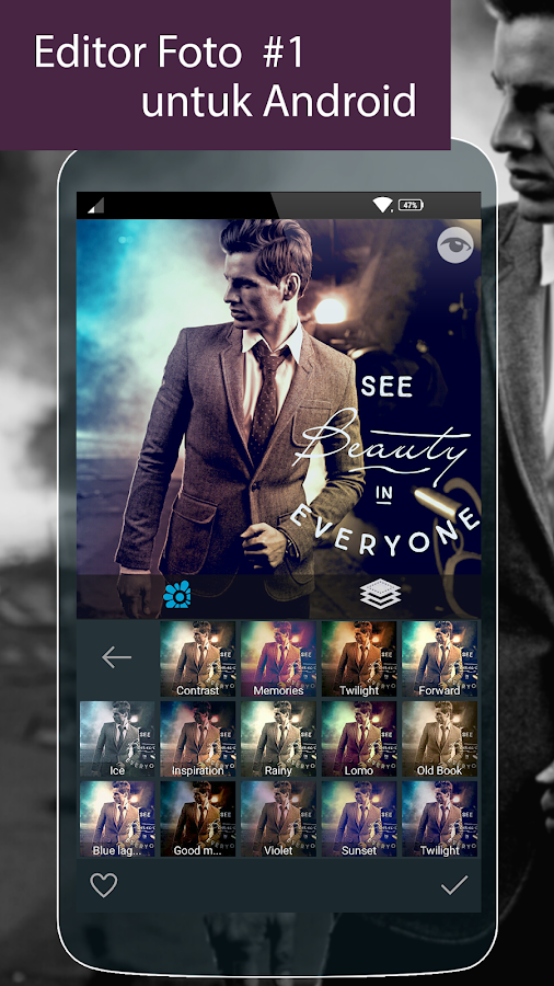 - 150+ unique filters in categories: ‘Lomo’, ‘Vintage’, ‘Simple tone’, ‘Black & White’, ‘Old Style’, ‘Cold tones’, ‘Warm tones’ and ‘Art’.