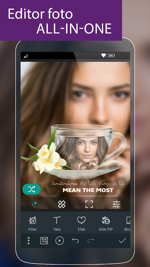 multiple ways of retouching your images.Turn your photos into masterpiece using a wide variety of effects, filters, color and text tools, frames,