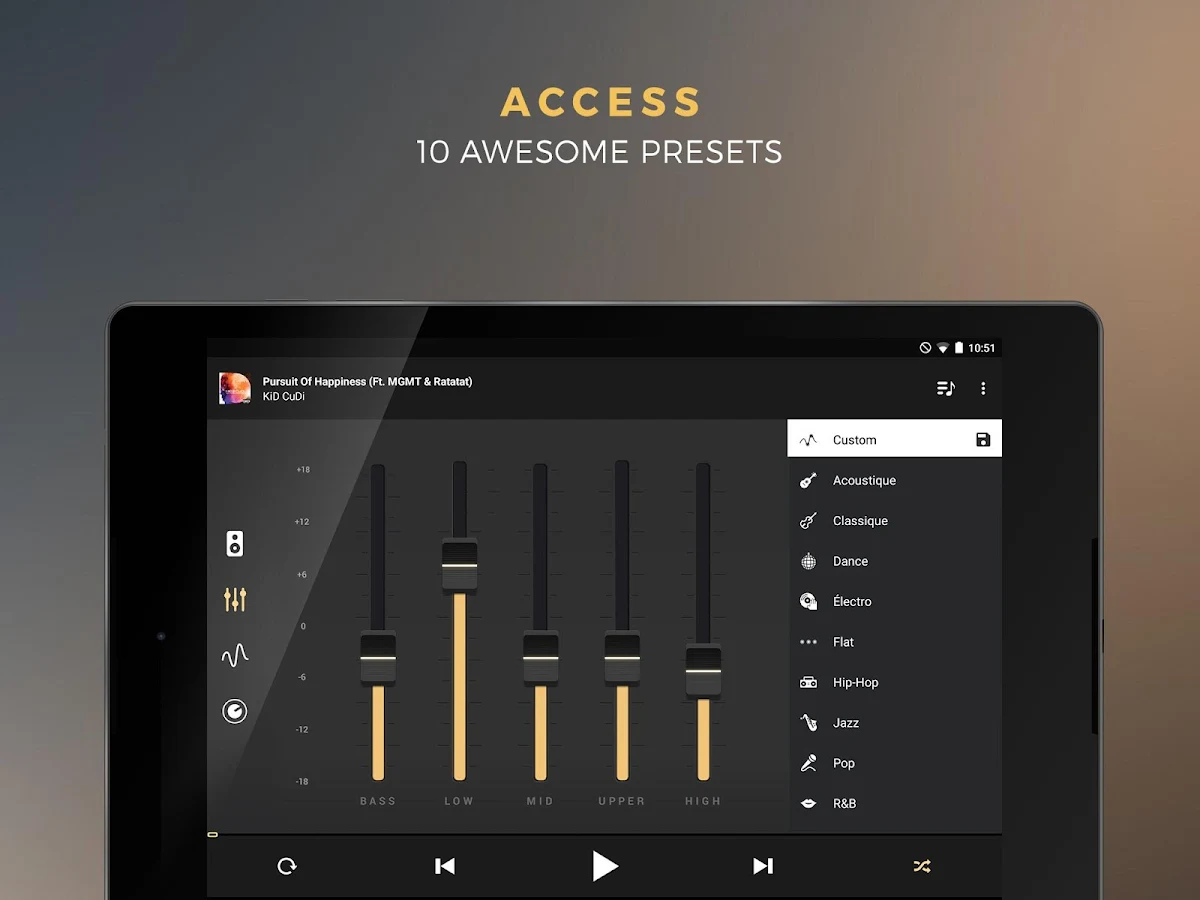 - 8 equalizer presets based on different music genres